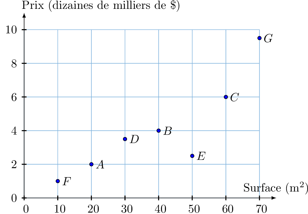 Vous analysez les prix des maisons en fonction de leur surface (en mètres carrés).
