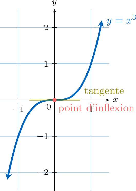 Lorsqu'on parcourt la courbe de gauche à droite, \(x\) augmente, mais la pente de la tangente diminue (de \(2\), à \(1\), à \(0\), à \(-1\), etc.).