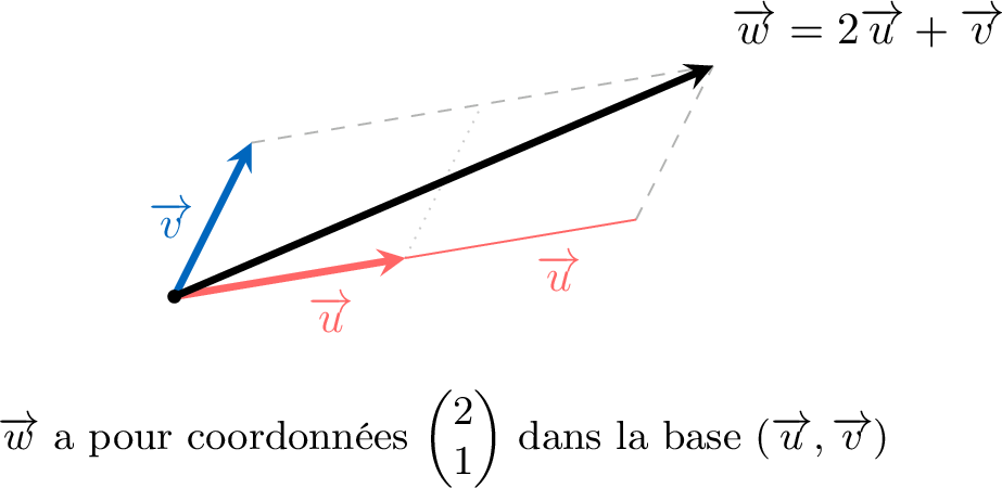 Soit \(\Vect{i}=\begin{pmatrix} 1 \\ 0 \end{pmatrix}\) une translation de 1 unité dans la direction positive des \(x\) et \(\Vect{j}=\begin{pmatrix} 0 \\ 1 \end{pmatrix}\) une translation de 1 unité dans la direction positive des \(y\). Ce déplacement est équivalent à 2 fois \(\Vect{i}\) plus 3 fois \(\Vect{j}\) :$$\begin{aligned}\Vect{v} & =2 \Vect{i}+3 \Vect{j} \\