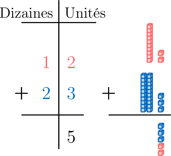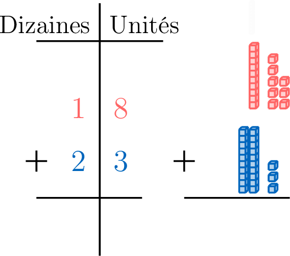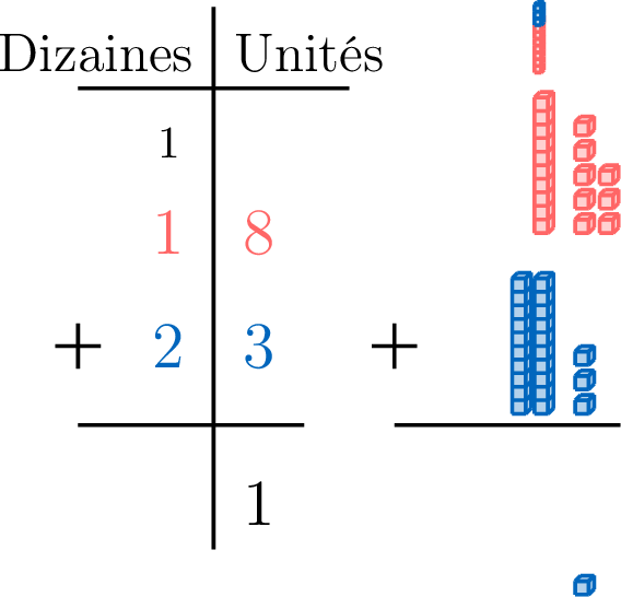 Au total, il y a \(\textcolor{colordef}{18} + \textcolor{colorprop}{23} = \textcolor{olive}{41}\) cubes.