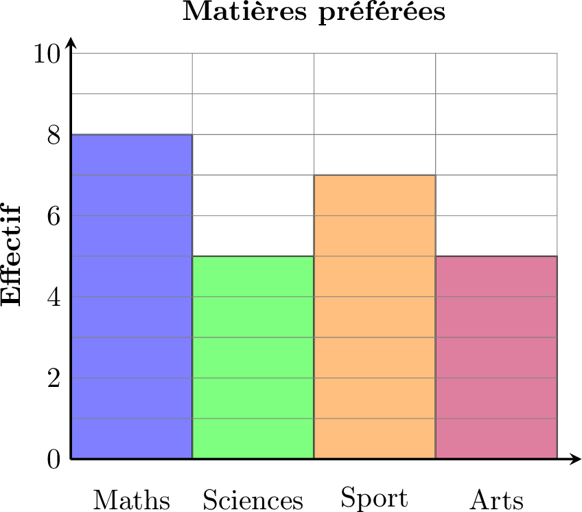 Voici un diagramme en bâtons montrant les données de notre tableau d'effectifs « Matière préférée ». Il nous aide à voir les résultats d'un coup d'œil.