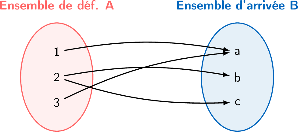 Une règle \(f\) associe des éléments de l'ensemble \(A = \{1, 2, 3\}\) à l'ensemble \(B = \{a, b, c\}\). Les correspondances sont montrées dans le diagramme ci-dessous.