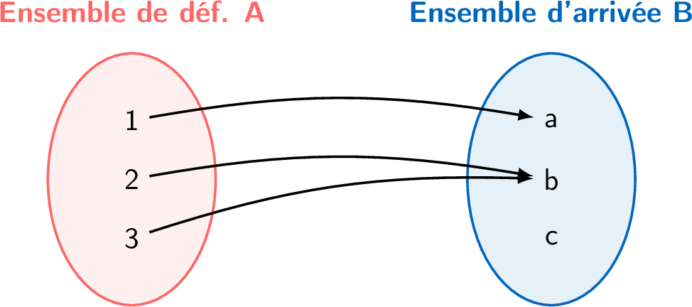 Une règle \(h\) associe des éléments de l'ensemble \(A = \{1, 2, 3\}\) à l'ensemble \(B = \{a, b, c\}\). Les correspondances sont montrées dans le diagramme ci-dessous.
