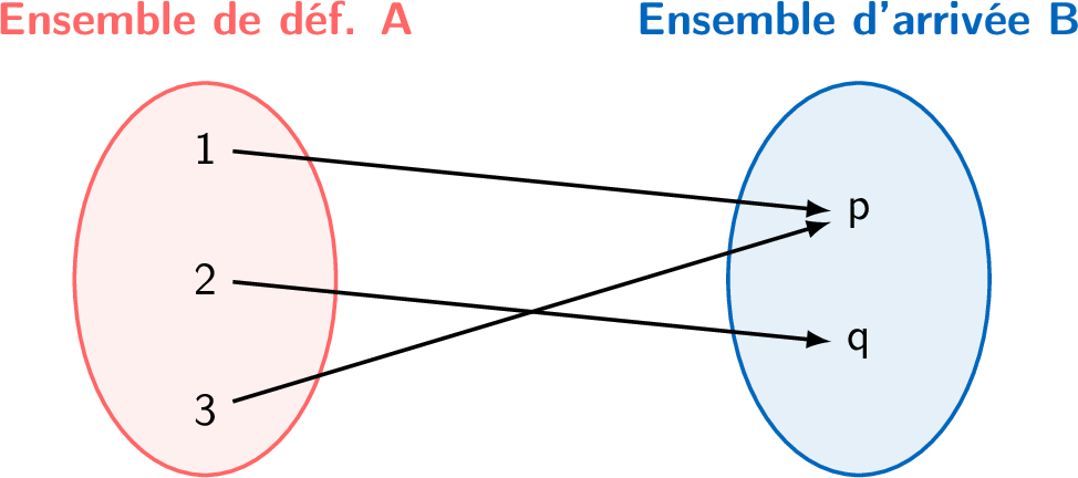 Soit \(A = \{1, 2, 3\}\) et \(B = \{p, q\}\). Une fonction \(f:A\rightarrow B\) est définie par le diagramme de correspondance ci-dessous.