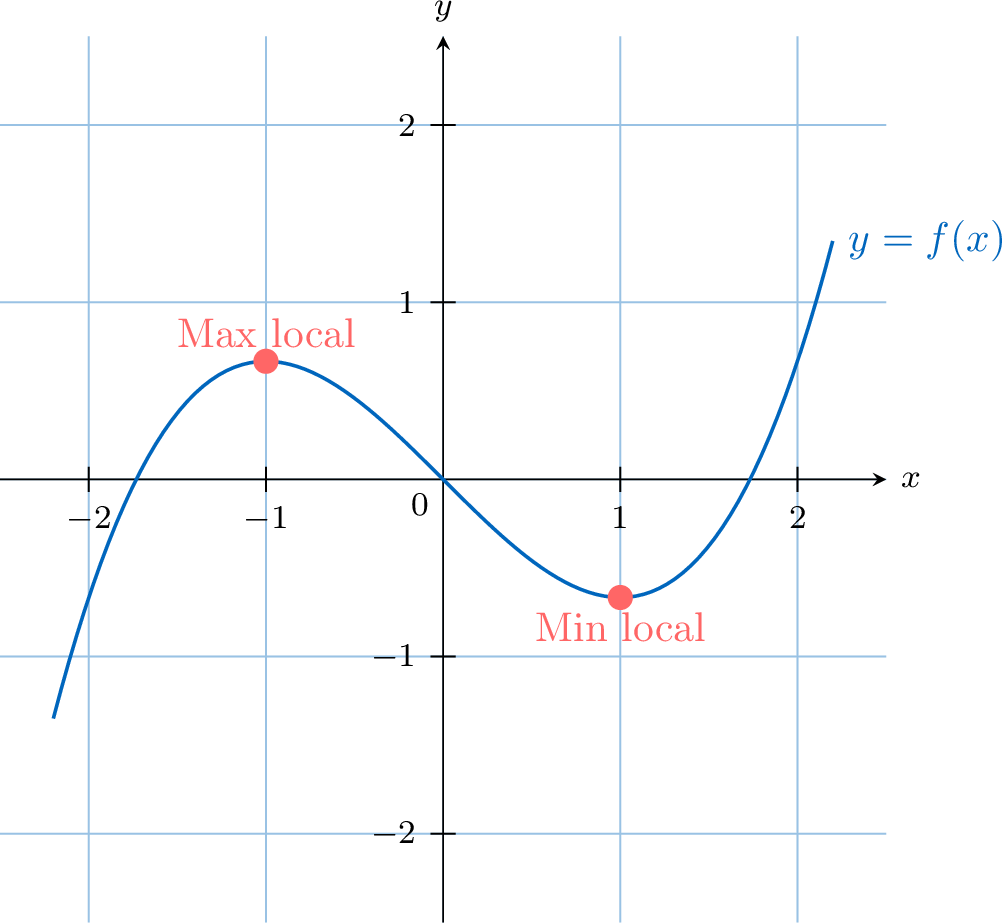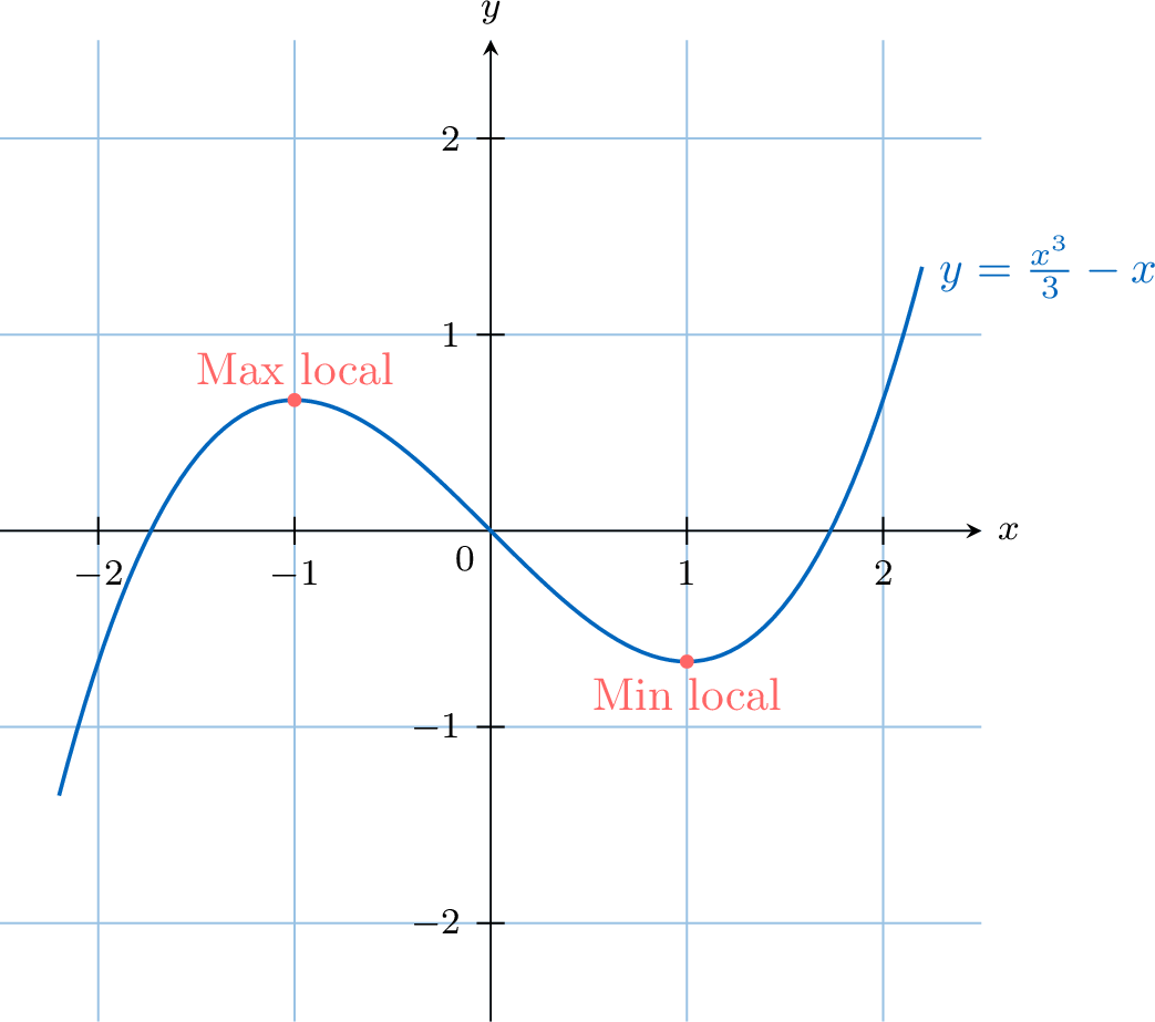 La fonction \(f(x) = \frac{x^3}{3} - x\) a un maximum local en \(x=-1\) et un minimum local en \(x=1\).
