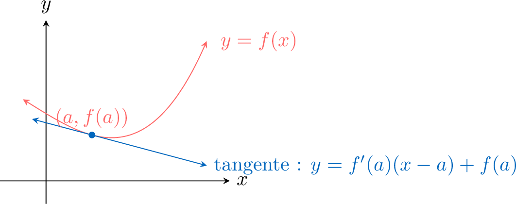On suppose que \(f\) est dérivable en \(x=a\) et que la tangente n'est pas verticale. L'équation de la tangente à la courbe \(y=f(x)\) au point \((a, f(a))\) est donnée par :$$\textcolor{colorprop}{y = f^{\prime}(a)(x-a)+f(a)}$$