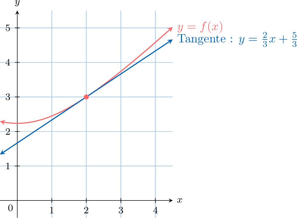 Soit \(B(x,y)\) un point quelconque de la droite tangente. Le point de tangence est \(A(a,f(a))\), qui appartient également à la droite tangente.