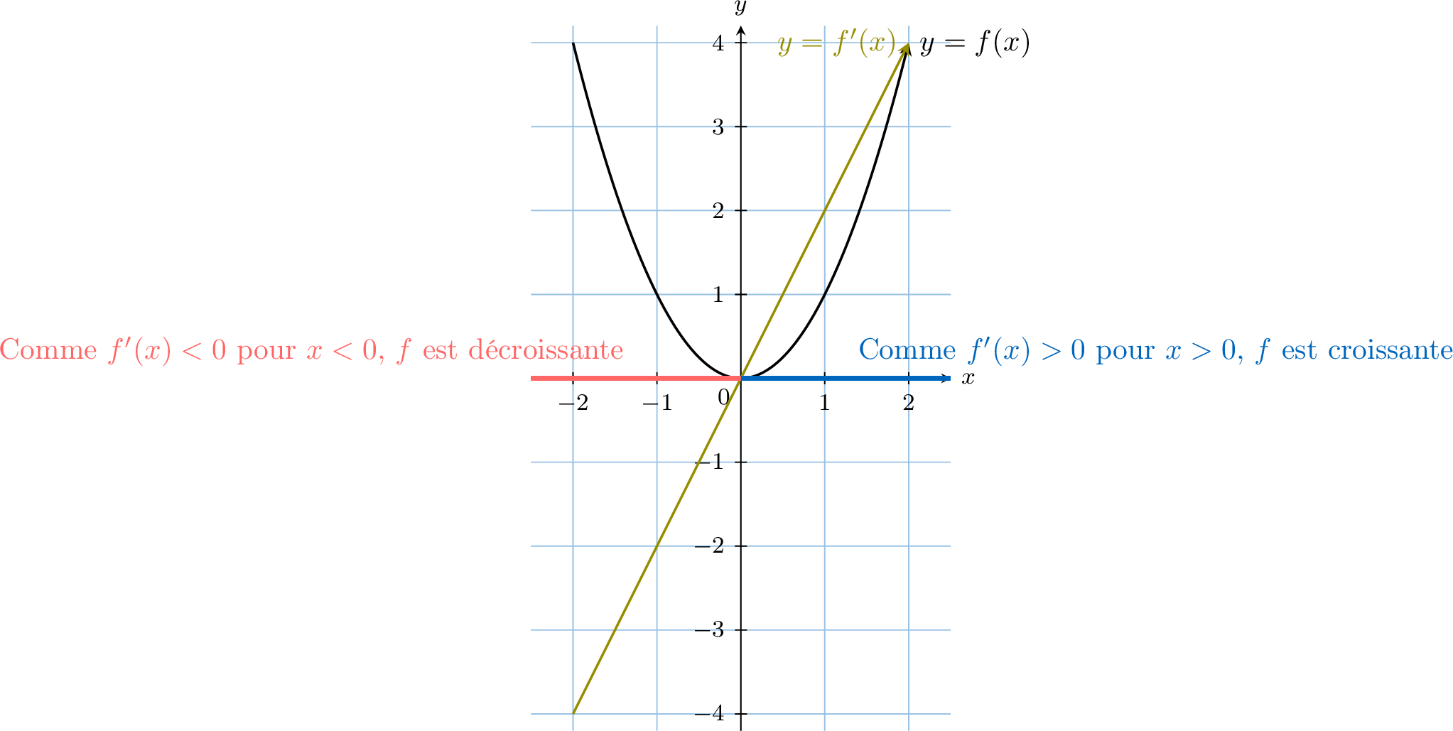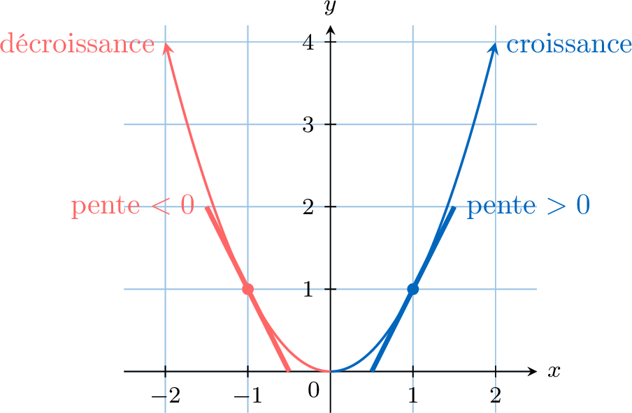 Une fonction est croissante là où la pente de sa tangente est positive, et décroissante là où la pente de sa tangente est négative.