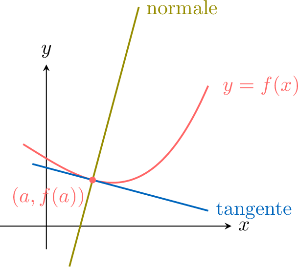 • si \(f'(a)\neq 0\), alors la normale a pour pente \(-\dfrac{1}{f'(a)}\) et $$\textcolor{colorprop}{y = -\frac{1}{f'(a)}(x-a)+f(a)};$$