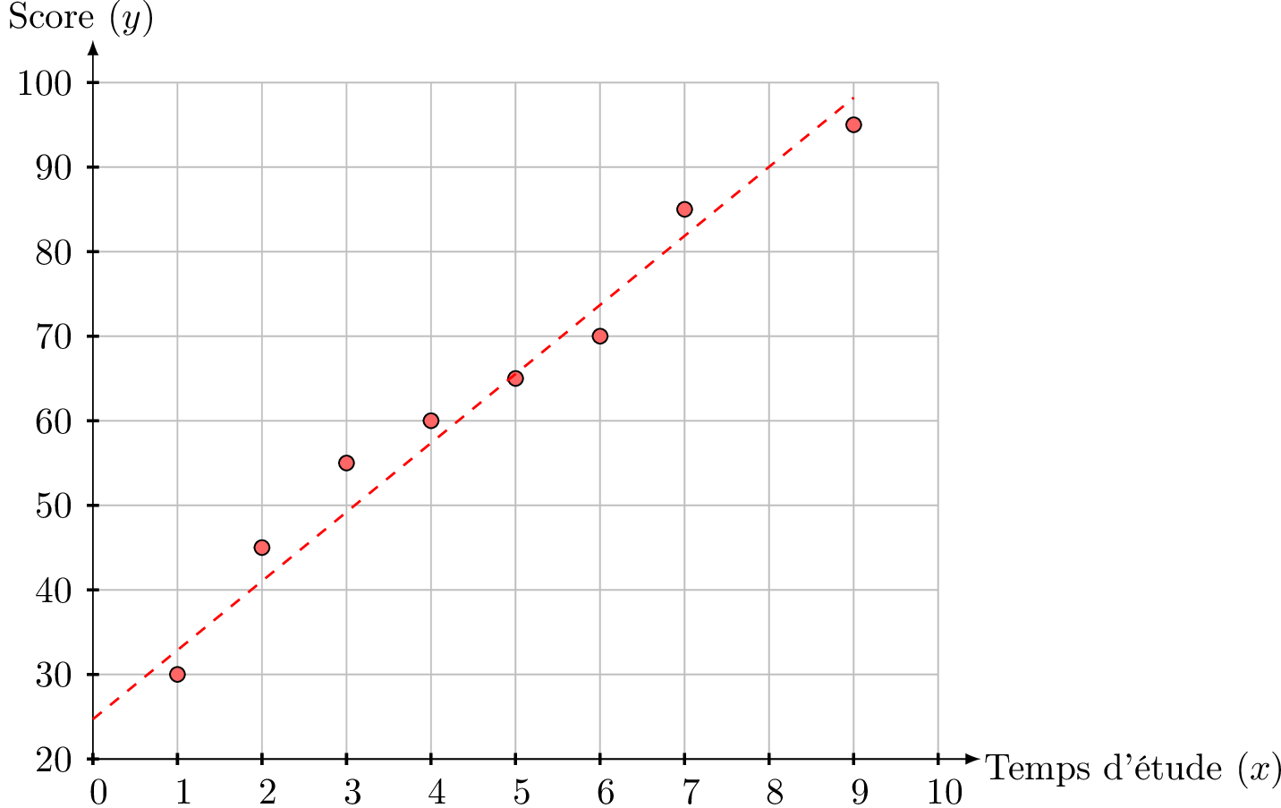 | Heures d’étude (\(x\)) | 5 | 10 | 8 | 15 |