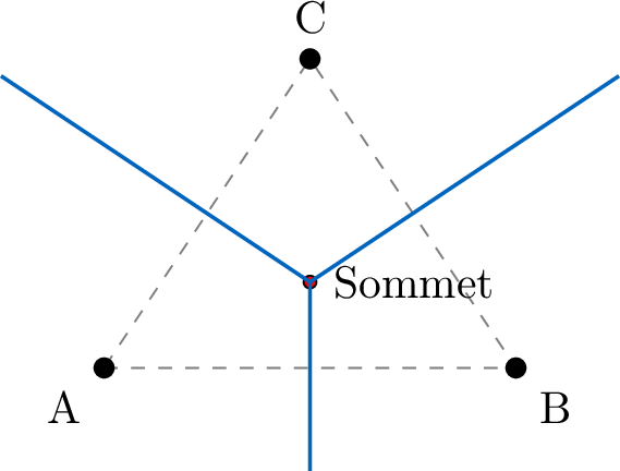 Puisque \(PA\) est la plus petite distance, le point \(P\) se trouve dans la région de Voronoï de \(A\). Vous êtes desservi par le bureau de poste \(A\).
