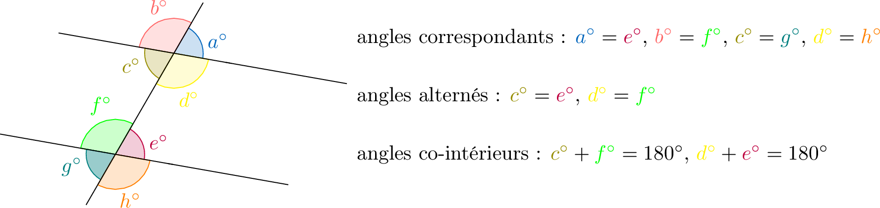 Dans ce chapitre, nous explorerons les relations essentielles entre les angles, qui sont indispensables pour résoudre des problèmes de géométrie. Tu apprendras ce que sont les angles complémentaires (de somme \(90^\circ\), formant un angle droit), les angles supplémentaires (de somme \(180^\circ\), formant un angle plat), les angles opposés par le sommet (formés par l’intersection de deux droites), ainsi que les angles créés par des droites parallèles coupées par une transversale : angles correspondants, alternés et co-intérieurs. Ces notions s'appuient sur ta compréhension des angles droits (\(90^\circ\)), des angles plats (\(180^\circ\)) et des angles pleins (\(360^\circ\)). Ces relations particulières entre les angles t’aideront à reconnaître des droites parallèles et à calculer des angles inconnus dans des figures géométriques.