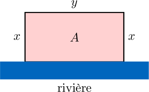 Soit \( x \) la longueur perpendiculaire à la rivière et \( y \) la longueur parallèle à la rivière.Trouve l’aire \( A \) du champ en fonction de \( x \).