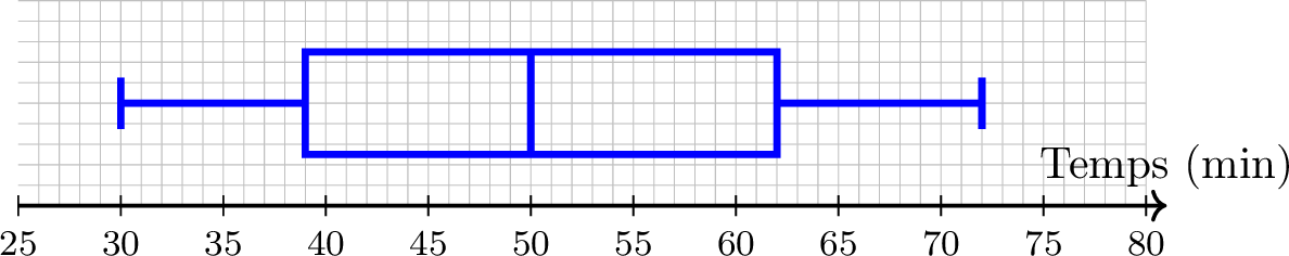 Ce diagramme en boîte montre le temps d'attente (en minutes) des passagers dans une salle d'embarquement.