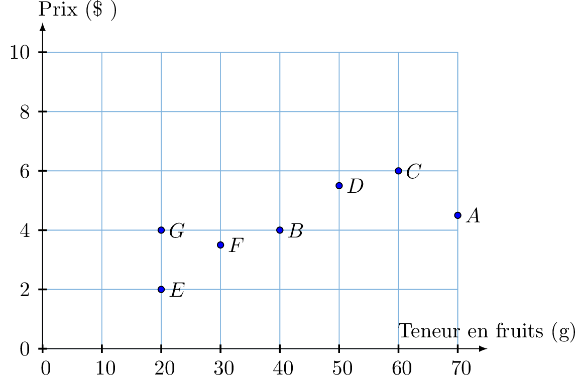 Vous faites des recherches sur des marques de confiture, en traçant le prix en fonction de la teneur en fruits (en grammes).