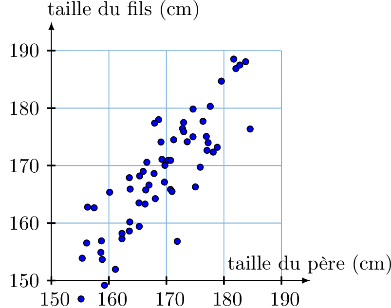 Un chercheur explore si les fils de pères plus grands ont tendance à être plus grands. Le nuage de points montre la relation entre la taille des pères et celle de leurs fils.