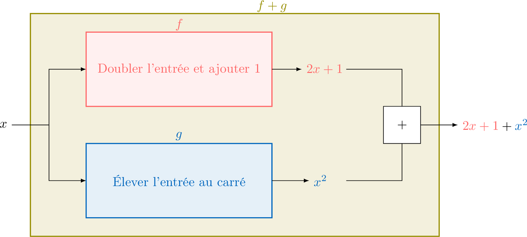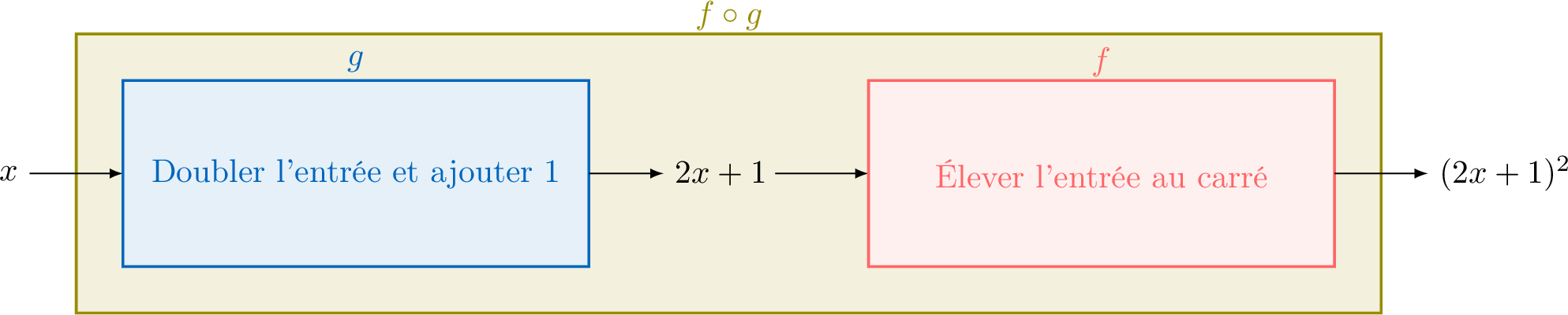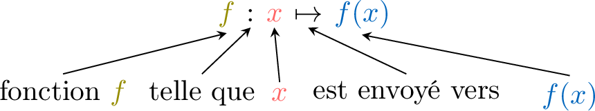 On utilise la notation fonctionnelle pour nommer les fonctions et leurs variables, en remplaçant "\(\textcolor{colordef}{\text{entrée}}\)" par "\(\textcolor{colordef}{x}\)" et "\(\textcolor{colorprop}{\text{sortie}}\)" par "\(\textcolor{colorprop}{f(x)}\)".