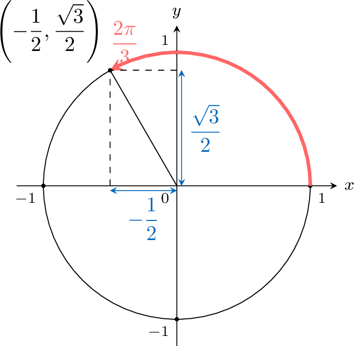 \(\cos \dfrac{2 \pi}{3}=-\dfrac{1}{2}\) et \(\sin \dfrac{2 \pi}{3}=\dfrac{\sqrt{3}}{2}\)