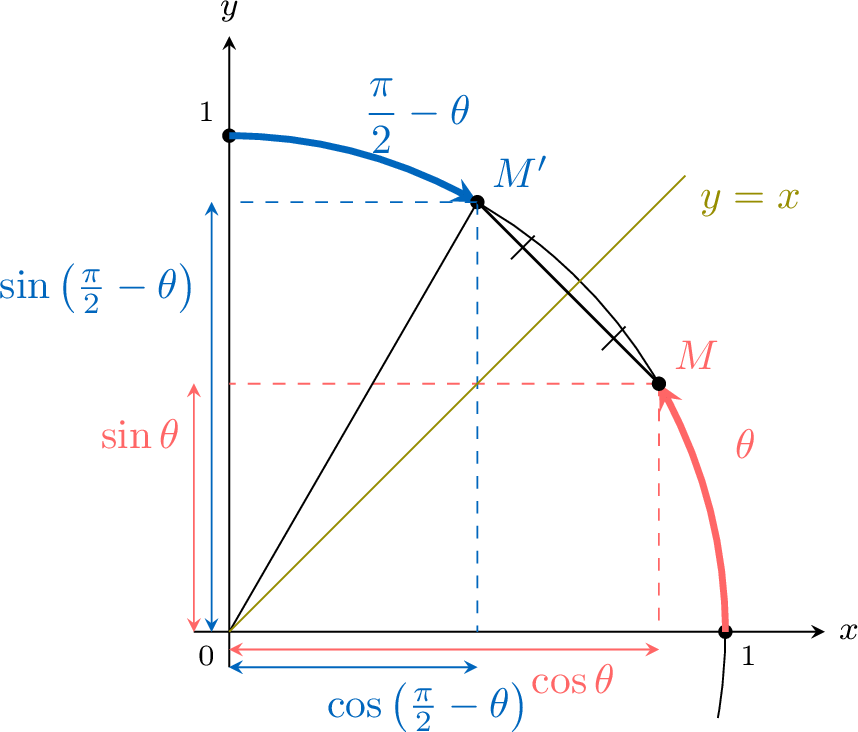 Soit \(M'(\cos(\frac \pi 2 -\theta),\sin(\frac \pi 2 -\theta))\) le point sur le cercle unité à l'angle \(\dfrac \pi 2 -\theta\).