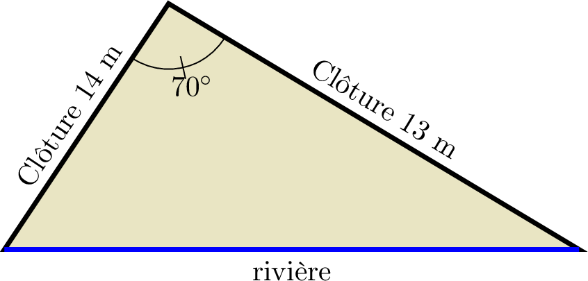 Un champ triangulaire est délimité par deux clôtures et une rivière rectiligne.