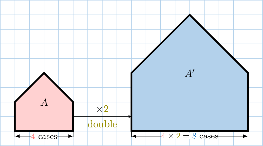 Le rectangle \( A \) est agrandi en \( A' \) en doublant les longueurs de ses côtés (en les multipliant par 2). Remarque comment la largeur et la hauteur doublent.