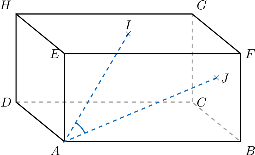 \(ABCDEFGH\) is a rectangular parallelepiped such that \(AB = 4\), \(AD = 2\), and \(AE = 2\). Let \(I\) be the center of the face \(EFGH\) and \(J\) be the center of the face \(BCGF\).