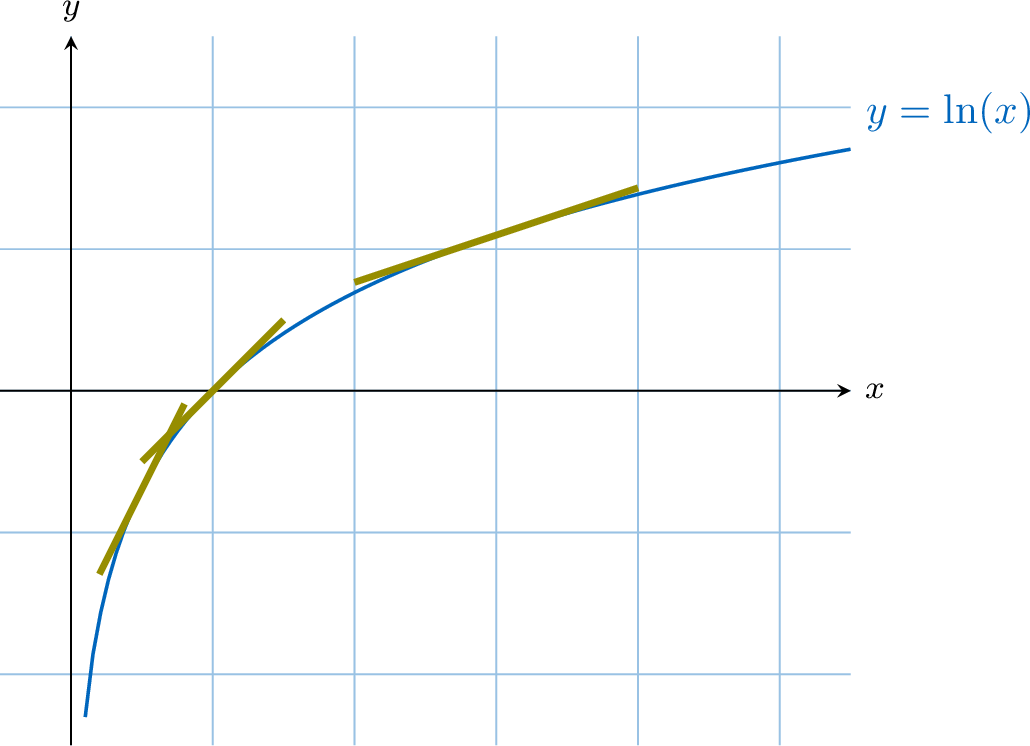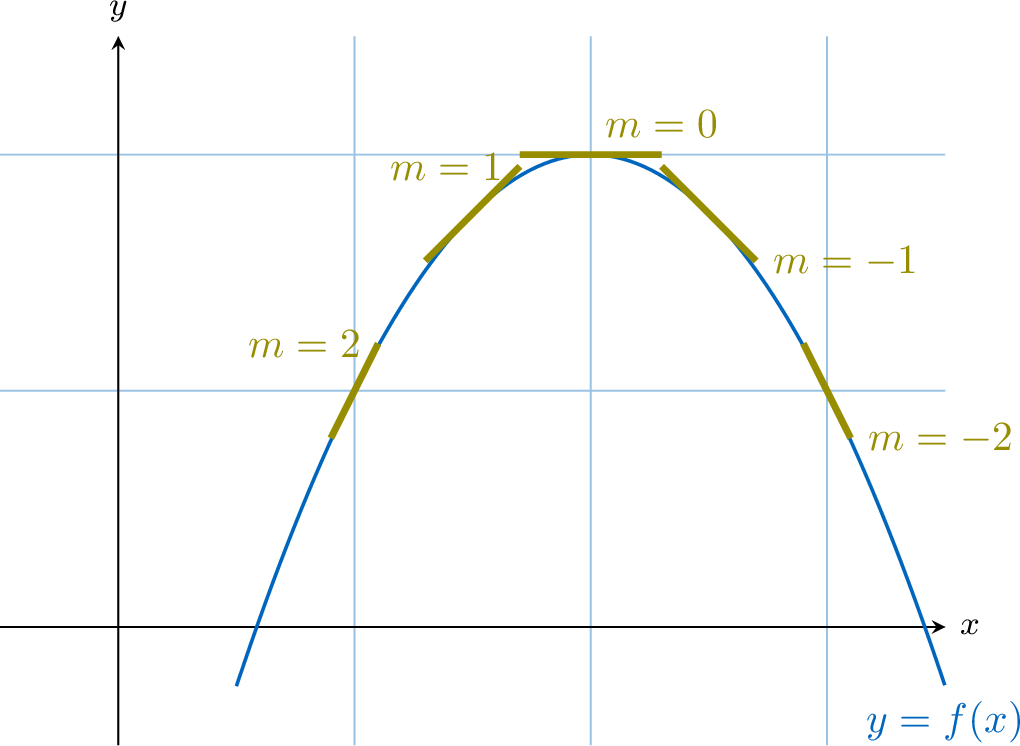 As we move along the curve from left to right, \(x\) increases, but the slope of the tangent decreases (from \(2\), to \(1\), to \(0\), to \(-1\), etc.).