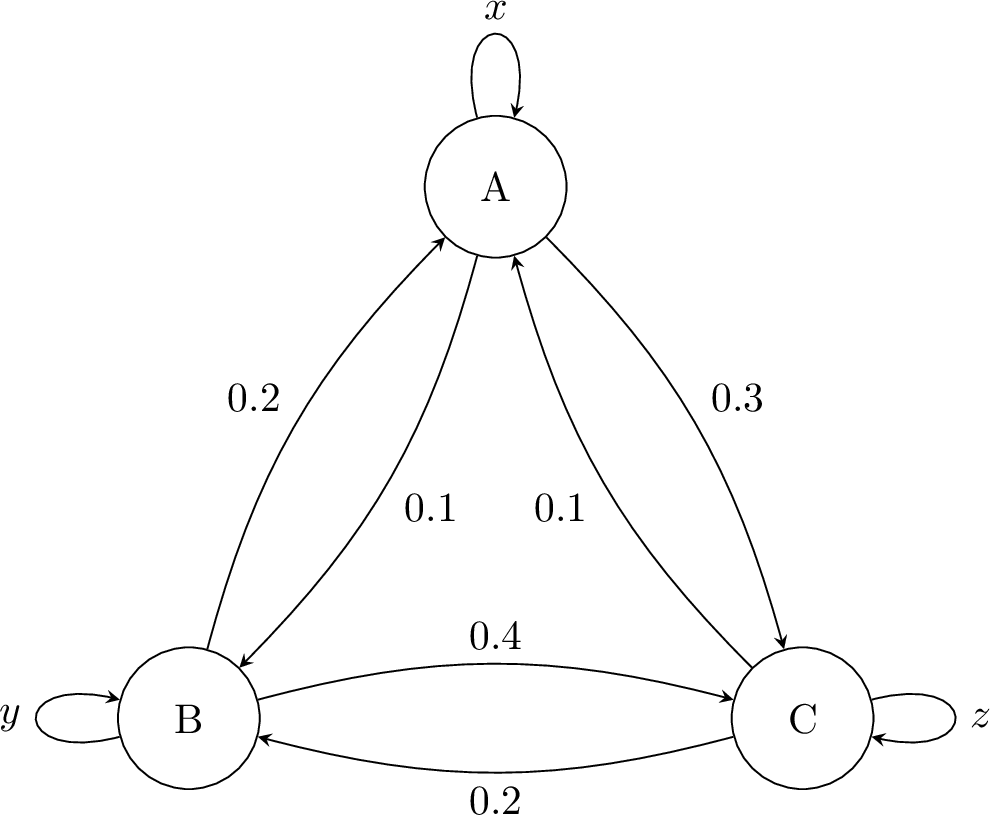 Three brands of cereal, A, B, and C, dominate the market. The transition diagram below shows the probability of a customer switching brands or staying with the same brand next week.
