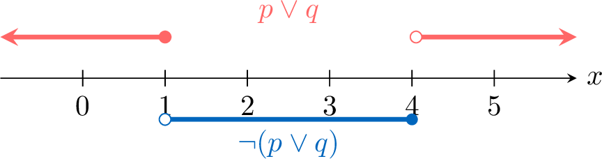Now, we combine them with an "and":$$ (\neg p \wedge \neg q) \text{ is } (x > 1) \wedge (x \le 4). $$This can be written more simply as the interval \(\boldsymbol{1 < x \le 4}\).