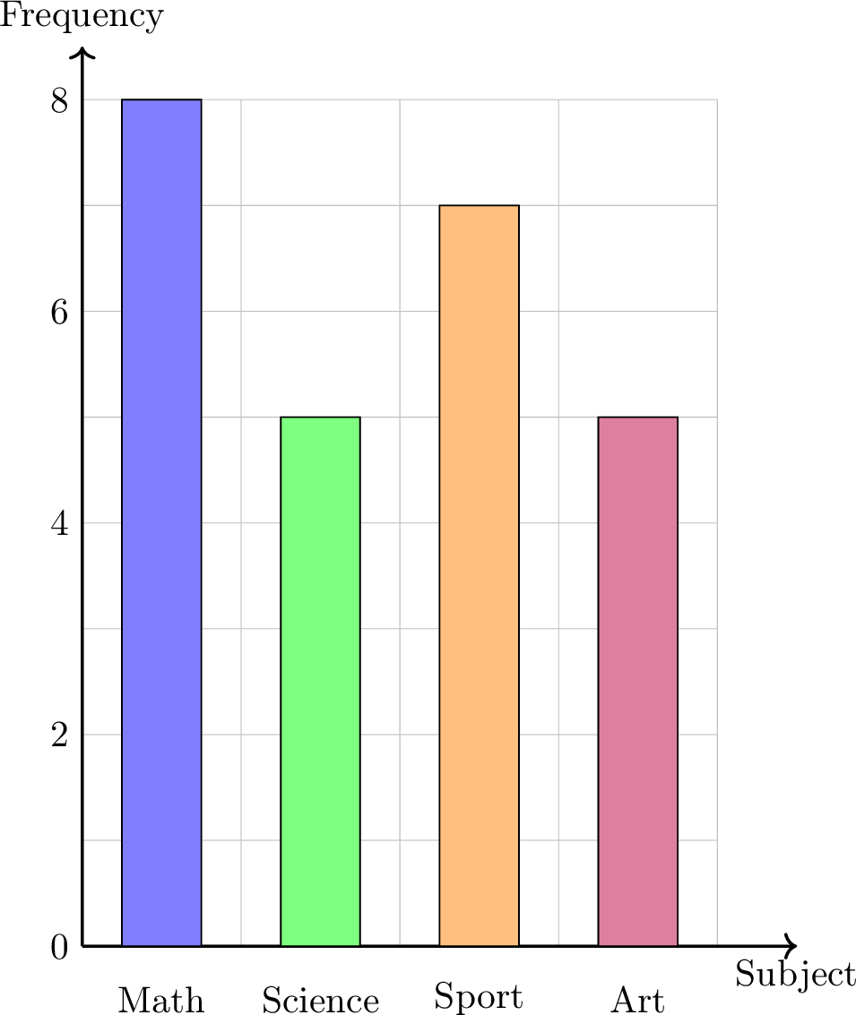 • Comparisons: More students chose Math (8) than Sport (7). The number of students who prefer Science is the same as the number who prefer Art (5).