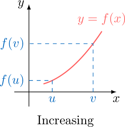 \(f\) is increasing on \(I\) if for all \(u\) and \(v\) in \(I\): $$\text{if } u \leq v, \text{ then } f(u) \leq f(v)$$ An increasing function preserves the order.