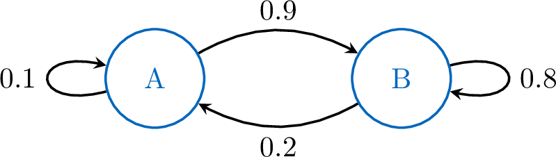 We consider a Markov chain \((X_n)\) represented by the probabilistic graph below, with an initial distribution \(\pi_0 = \begin{pmatrix} 1 & 0 \end{pmatrix}\).