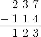 To find what is left, we subtract:$$237-114$$Visually, we can see that when we take 114 blocks away from 237, we are left with 123.