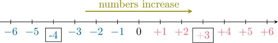 In the set of integers, the order is defined as:$$\dots\lt\textcolor{colorprop}{-3}\lt\textcolor{colorprop}{-2}\lt\textcolor{colorprop}{-1}\lt 0 \lt \textcolor{colordef}{+1}\lt\textcolor{colordef}{+2}\lt\textcolor{colordef}{+3}\lt\dots $$So, as you move along the number line from left to right, the numbers increase.