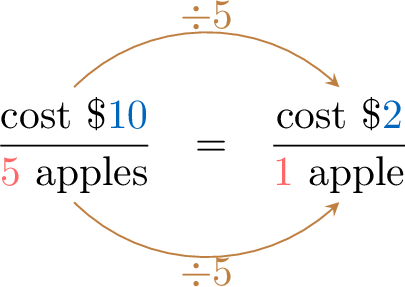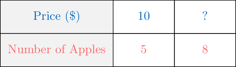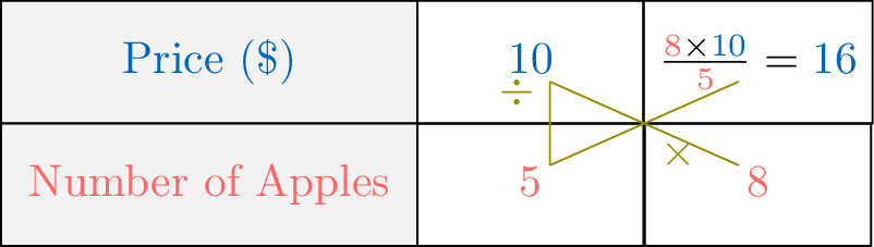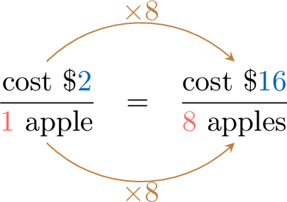 \(\dfrac{\dollar\textcolor{colorprop}{10}}{\textcolor{colordef}{5} \text{ apples}} = \dfrac{\dollar\textcolor{colorprop}{x}}{\textcolor{colordef}{8} \text{ apples}}\)