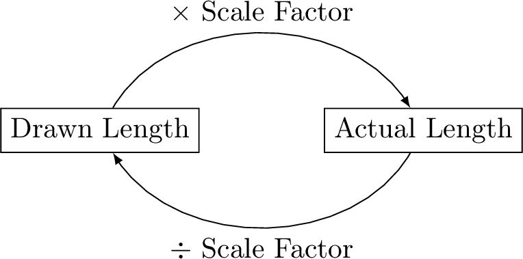 &= 3\,\mathrm{cm}\end{aligned}$$A \(6\,\mathrm{m}\) actual length is represented by a \(3\,\mathrm{cm}\) drawn length.