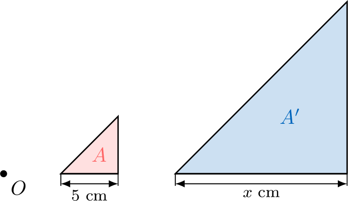 The figure \(\textcolor{colorprop}{A'}\) is the image of figure \(\textcolor{colordef}{A}\) under a homothety with center \(O\) and scale factor \(k=3\).