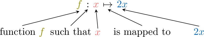 we have \(\textcolor{olive}{f}(\textcolor{colordef}{x}) = \textcolor{colorprop}{2x}\).