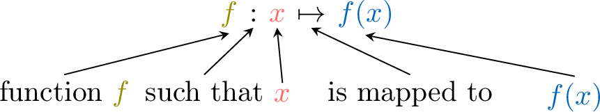 We use function notation to name functions and their variables, replacing "\(\textcolor{colordef}{\text{input}}\)" by "\(\textcolor{colordef}{x}\)" and "\(\textcolor{colorprop}{\text{output}}\)" by "\(\textcolor{colorprop}{f(x)}\)".