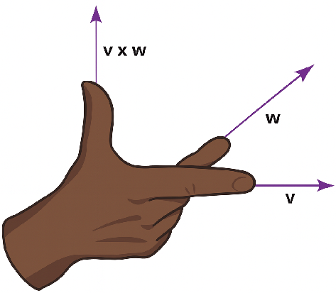 No. By pointing the fingers of the right hand in the direction of \(\Vect{v}\) (along the positive x-axis) and curling them toward the direction of \(\Vect{w}\) (along the negative z-axis), the thumb points in the direction of the positive y-axis.