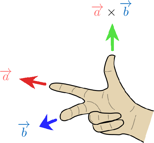 The diagram below illustrates three vectors, \(\Vect{a}\), \(\Vect{b}\), and their vector product \(\Vect{a} \times \Vect{b}\).