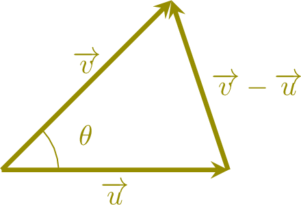 The Law of Cosines applied to the triangle formed by \(\Vect{u}\), \(\Vect{v}\), and \(\Vect{v}-\Vect{u}\) states:$$\|\Vect{v}-\Vect{u}\|^2 = \|\Vect{u}\|^2+\|\Vect{v}\|^2-2\|\Vect{u}\|\|\Vect{v}\| \cos \theta$$By expanding the squared norms in terms of coordinates: