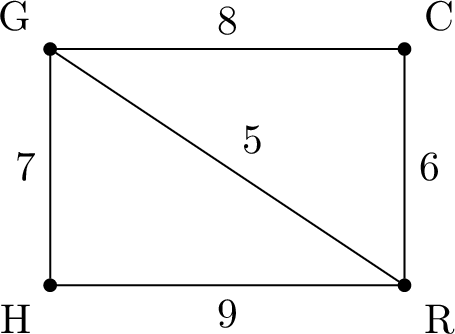 A city council plans to build bike lanes connecting four parks: Green Park (\(G\)), Central Park (\(C\)), Riverside Park (\(R\)), and Hilltop Park (\(H\)). The costs (in thousands of euros) to build lanes between these parks are given in the weighted graph below.