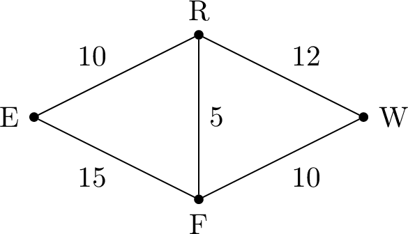An amusement park wants to install a fiber optic network to connect four main zones: the Entrance (\(E\)), the Roller Coasters (\(R\)), the Food Court (\(F\)), and the Water Park (\(W\)). The costs of laying the cables between these zones (in thousands of dollars) are shown in the weighted graph below.