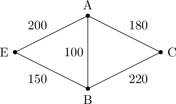A park ranger needs to inspect every path in a park shown by the graph below. The lengths of the paths are given in meters. The ranger starts at the entrance \(E\) and must return to \(E\).