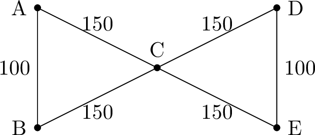 A maintenance worker needs to paint the lines on the paths of a small park, represented by the graph below. The lengths are in meters. The worker starts at the central intersection \(C\) and must return to \(C\) after painting every path exactly once.