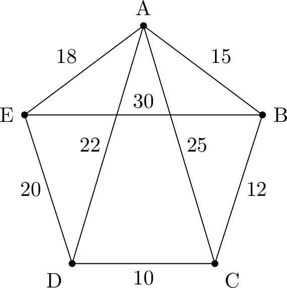 A politician is campaigning and needs to visit 5 towns: \(A, B, C, D, E\). The travel times (in minutes) are given in the weighted graph below. The politician starts at town \(A\) and must visit every town exactly once before returning to \(A\).