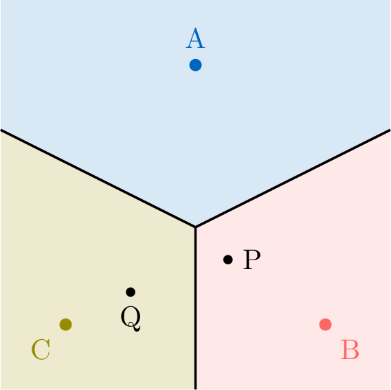 Consider the Voronoi diagram below for sites \(A\), \(B\), and \(C\).