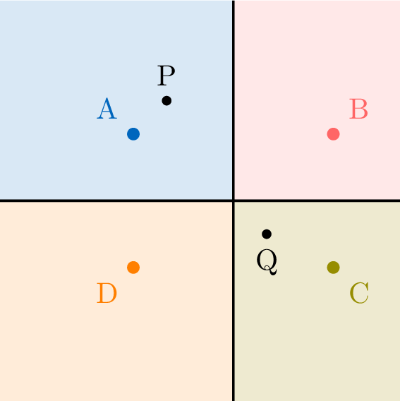 Consider the Voronoi diagram below for sites \(A\), \(B\), \(C\), and \(D\).