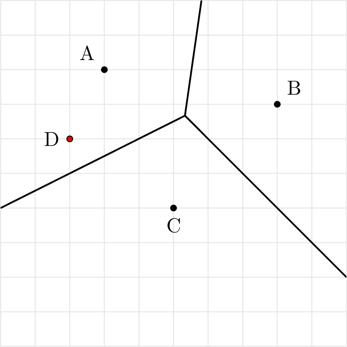 Site \(D\) is to be added to the Voronoi diagram shown below for sites \(A\), \(B\), and \(C\). Note that triangle \(ABC\) is scalene (all sides are of different lengths).
